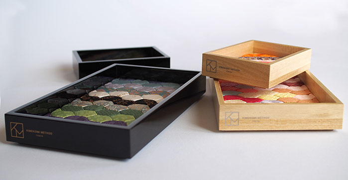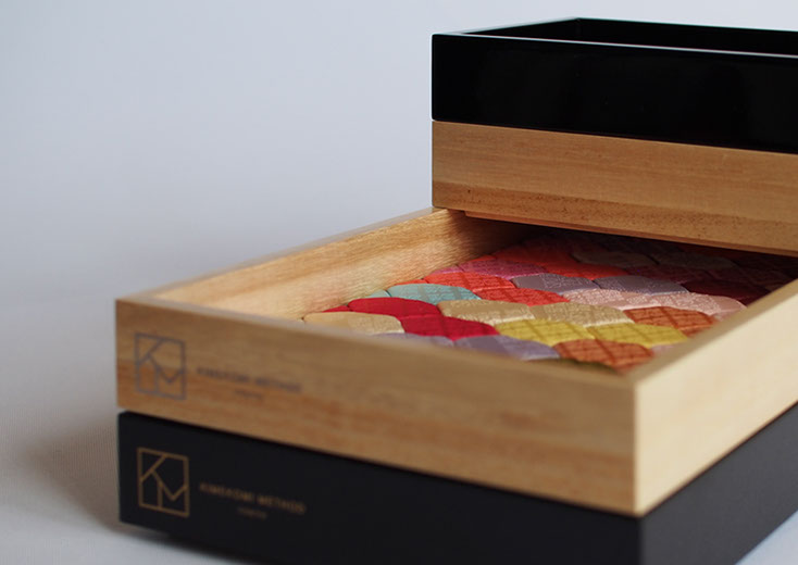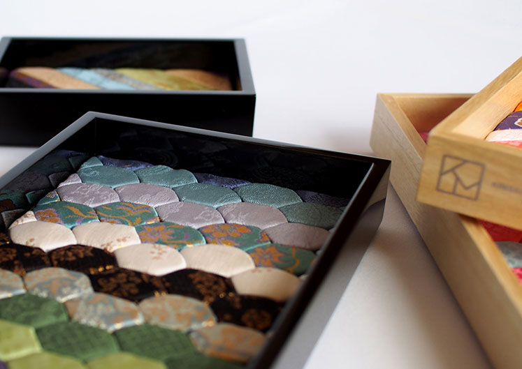 Kimekomi dolls and the techniques have been handed down for a long time and are known as Hina Ningyo and Gogatsu Ningyo. ’Kimekomi’ means a technique of carving lines in the body made from solidified wood powder with starch and inserting kimono fabric into the gaps. ‘KIMEKOMI TRAY’ is used the same technique combined with new material. Yuko Minamide designs to use the technique in a two-dimensional way with added soft synthetic sheet in order to have cushioned surface to hold your precious watches and jewellery. Aizu-nuri, one of the traditional artworks in the Aizu region in Fukushima is applied to the frame to add a glossy and rich texture. The colour composition and auspicious hexagonal pattern are used to express delicacy and luxury. ‘KIMEKOMI TRAY’ will radiant your everyday life. It is also a perfect gift for special occasions.